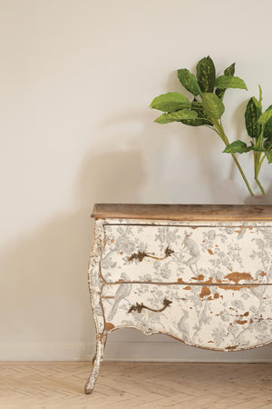 Step 5: Lightly spray with a steady mist of water to wet the sheet. Use a smooth damp sponge, a soft folded cloth or a small IOD Silicone Paint Blade and dab with even light pressure so that the pattern makes good contact with the painted surface. Avoid excessive movement or dragging of the Paint Inlay after it has been placed, as this may cause blurring or smudging.