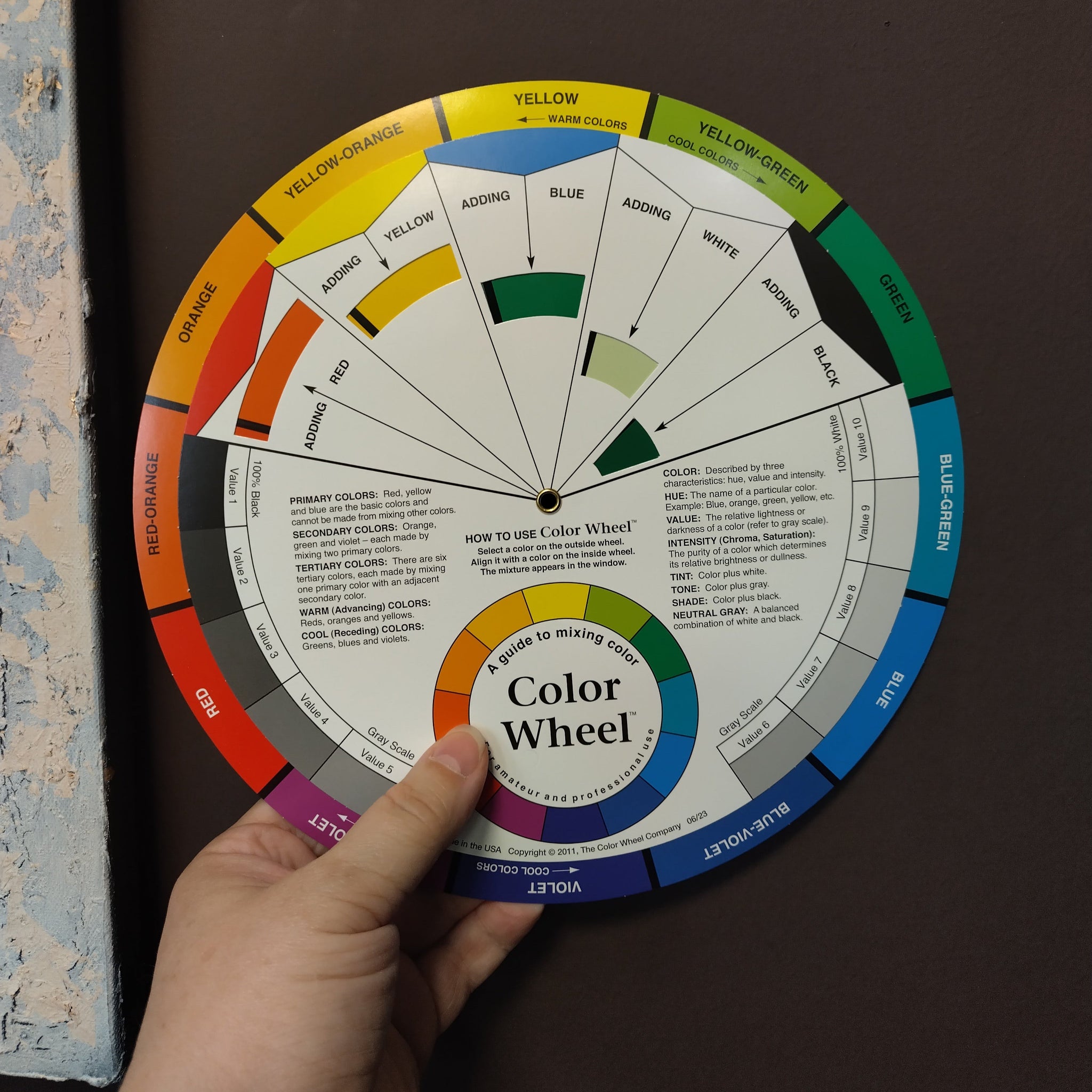 Kaksipuolinen väriympyrä sisältää kolme pääväriä, punaisen, keltaisen ja sinisen, sekä kolme toissijaista väriä, vihreän, oranssin ja violetin (kun kaksi pääväriä sekoitetaan keskenään, ne muodostavat toissijaisen värin).