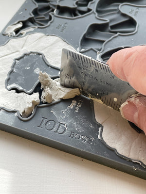 Pidämme näistä ominaisuuksista, sillä ne antavat kuluneen, aidon vintage-ilmeen. Suosikkitapamme soveltaa muottiin valettuja kappaleita on poistaa ne muotista, kun ne ovat vielä kosteita, ja kiinnittää ne pintaan sopivalla liimalla, jotta ne mukautuvat hyvin, varsinkin jos haluat kiinnittää koristeen kuperaan tai kaarevaan pintaan. Pystysuorilla pinnoilla voit käyttää myös teippiä pitämään koristeen paikaallaan.
