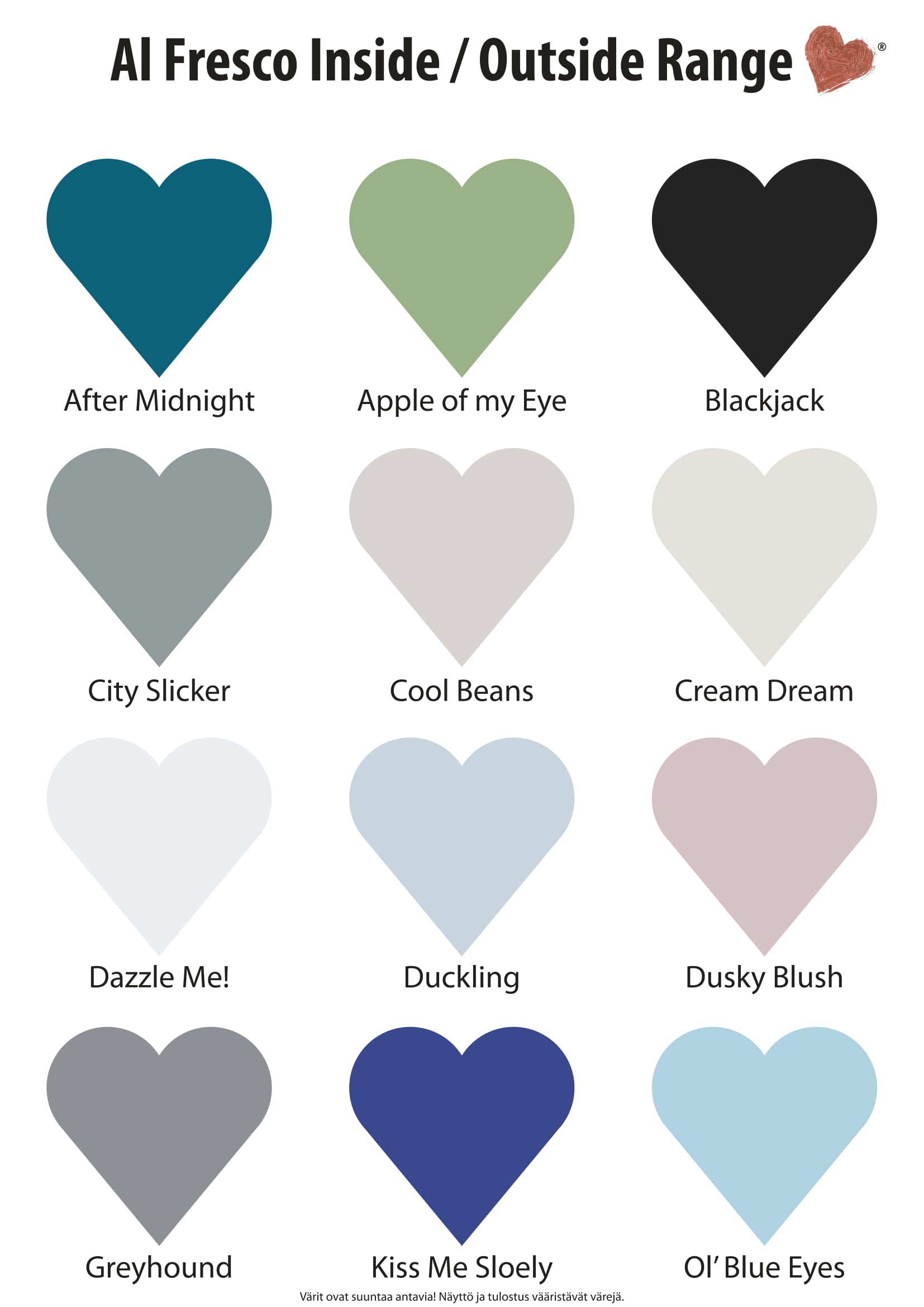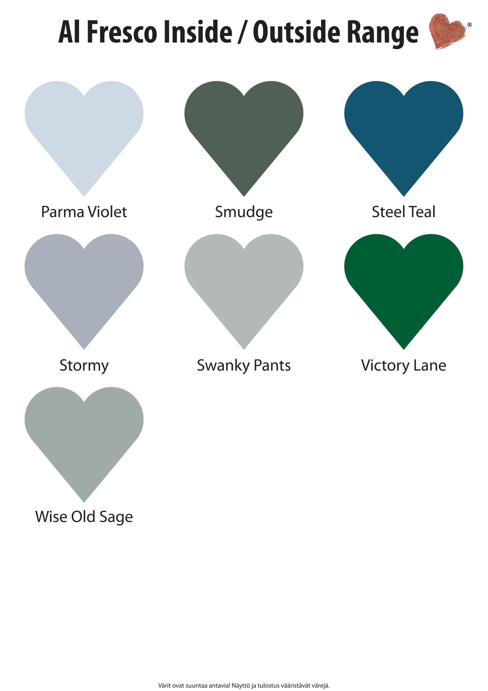 Meillä on neljä maalisarjaa, joista kaikki sopivat sisäpinnoille ja ulos soveltuu Al Fresco sarja: